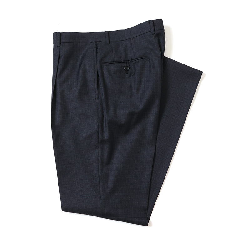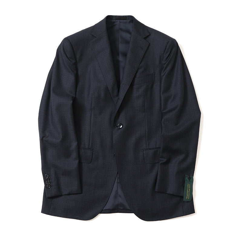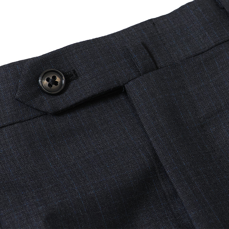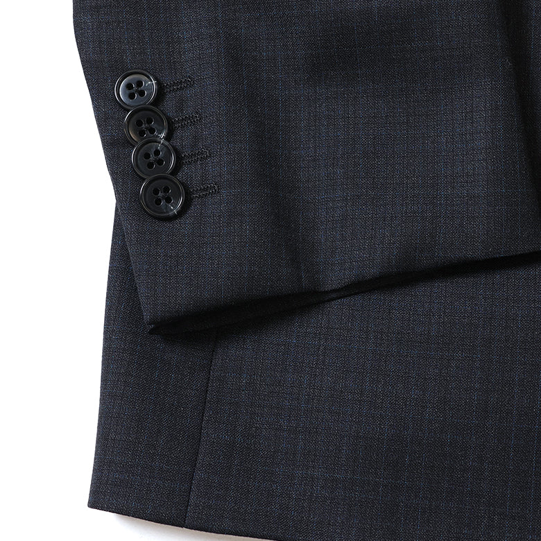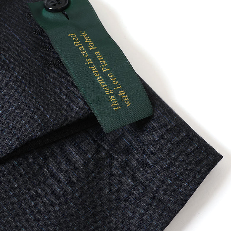 仕様 | 【ジャケット】:三つボタン段返りモデル/AMFステッチ/サイドベンツ/袖ボタンキッシング(重ねボタン付け)/各パーツD管留め/袖ストライプ 【パンツ】:ワンタックモデル/両玉左右ボタン止め/各パーツD管留め/ストレッチインベル芯 |