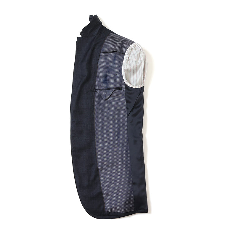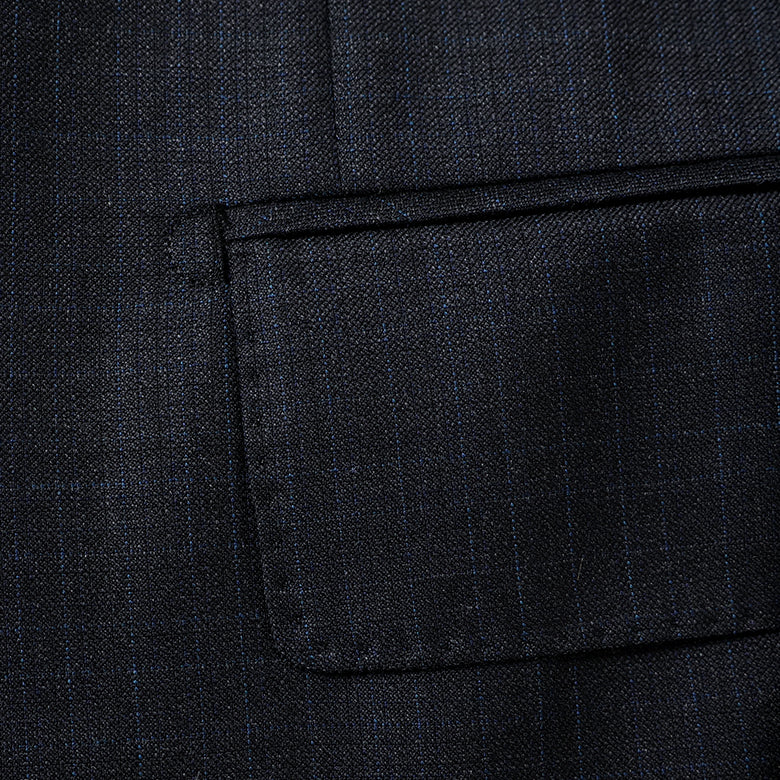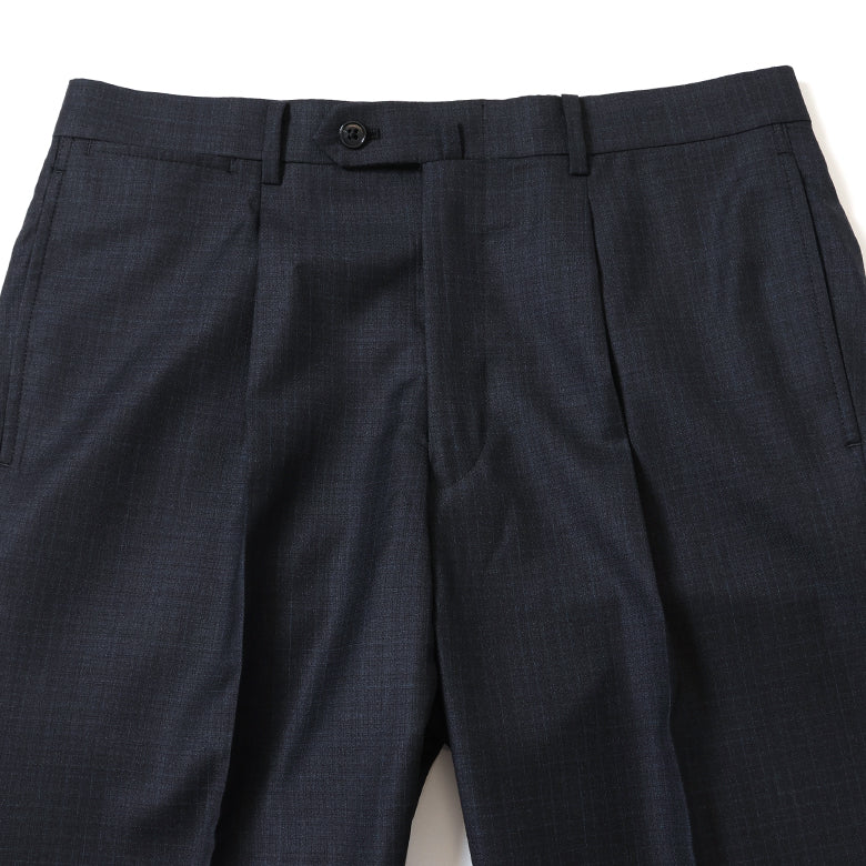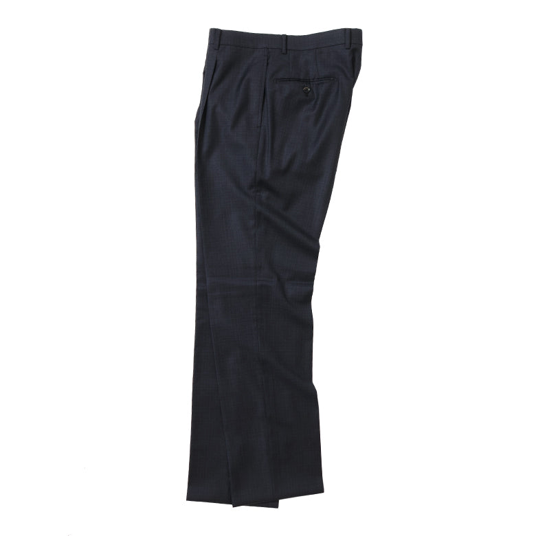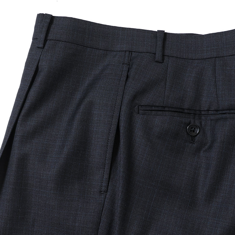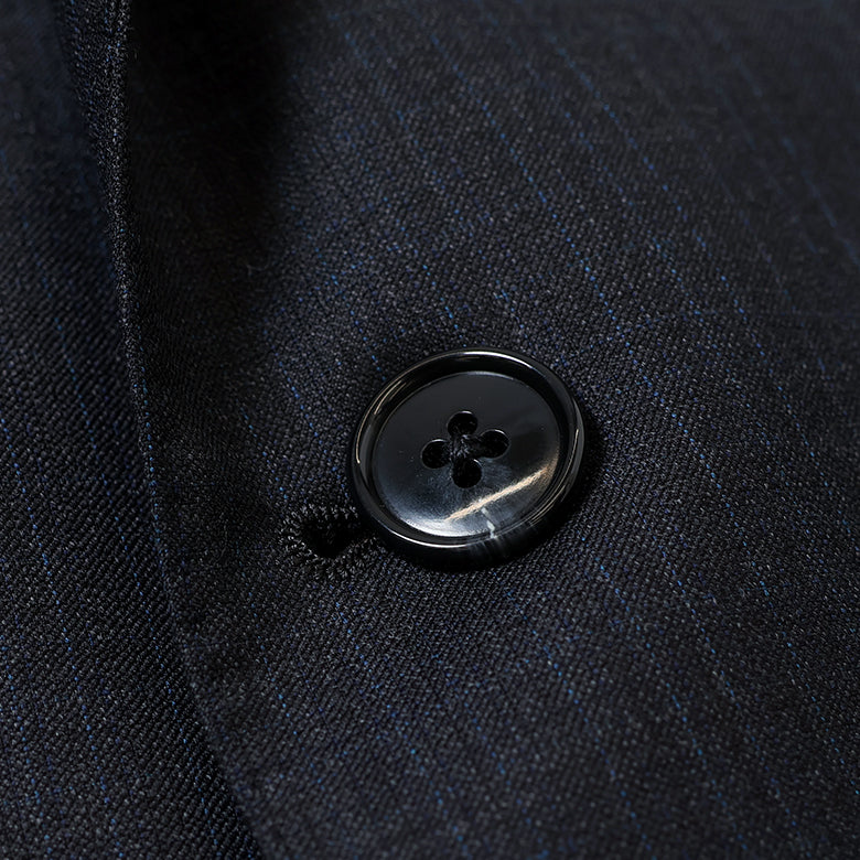 仕様 | 【ジャケット】:三つボタン段返りモデル/AMFステッチ/サイドベンツ/袖ボタンキッシング(重ねボタン付け)/各パーツD管留め/袖ストライプ 【パンツ】:ワンタックモデル/両玉左右ボタン止め/各パーツD管留め/ストレッチインベル芯 |