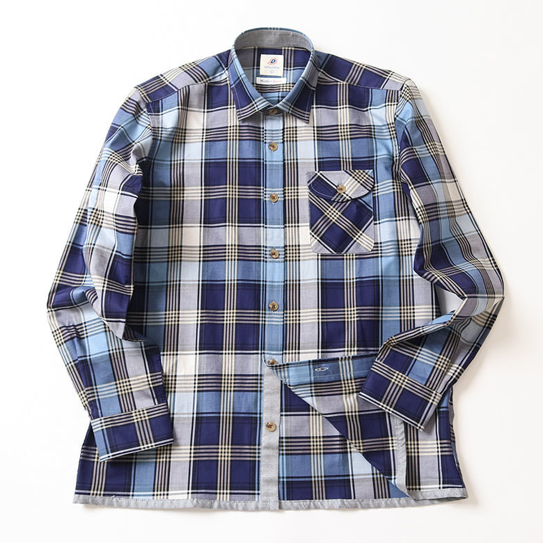 立ち襟仕様の本格的なつくりになっていますが、カジュアルな着こなしから、ドレスアップのコーディネートまで幅広くお使いいただける程よいバランスのシャツです。