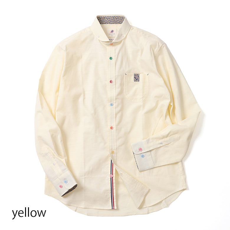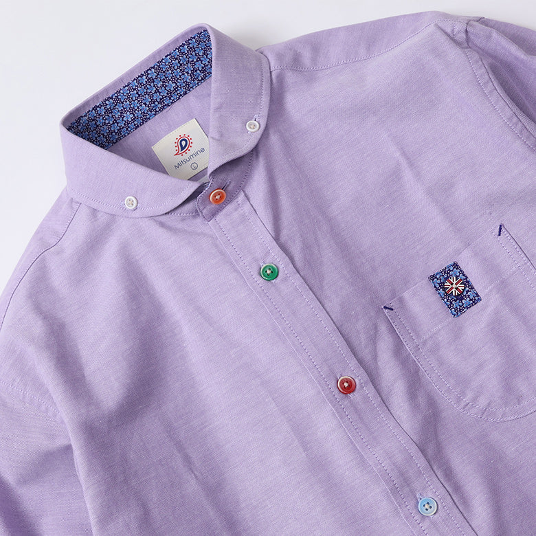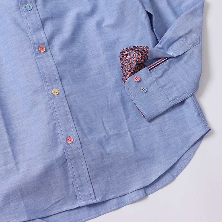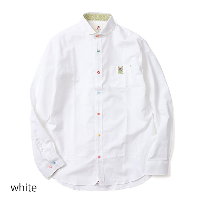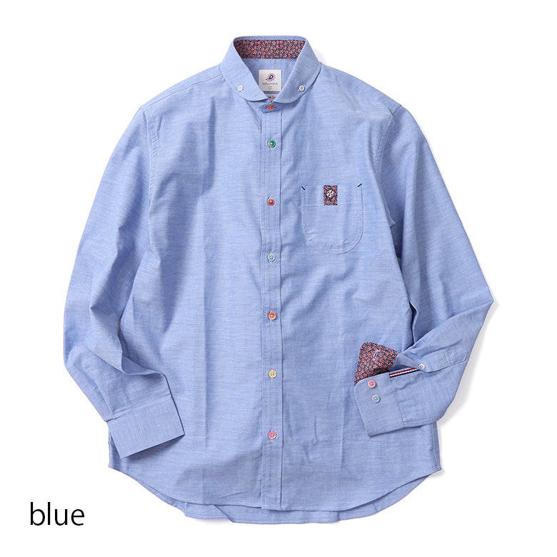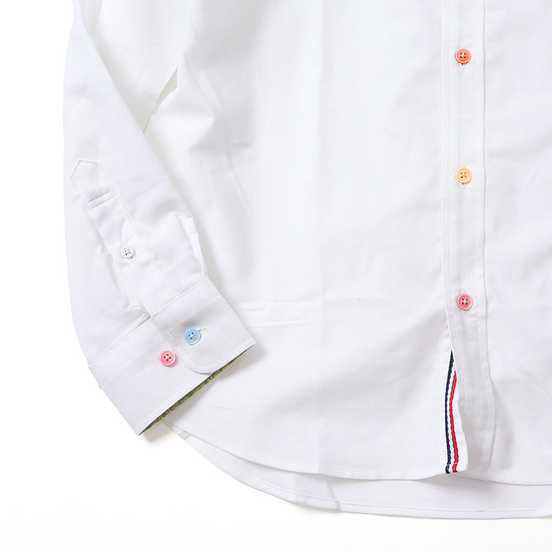カラフルなボタンがアクセントになったオックスフォードシャツ。
