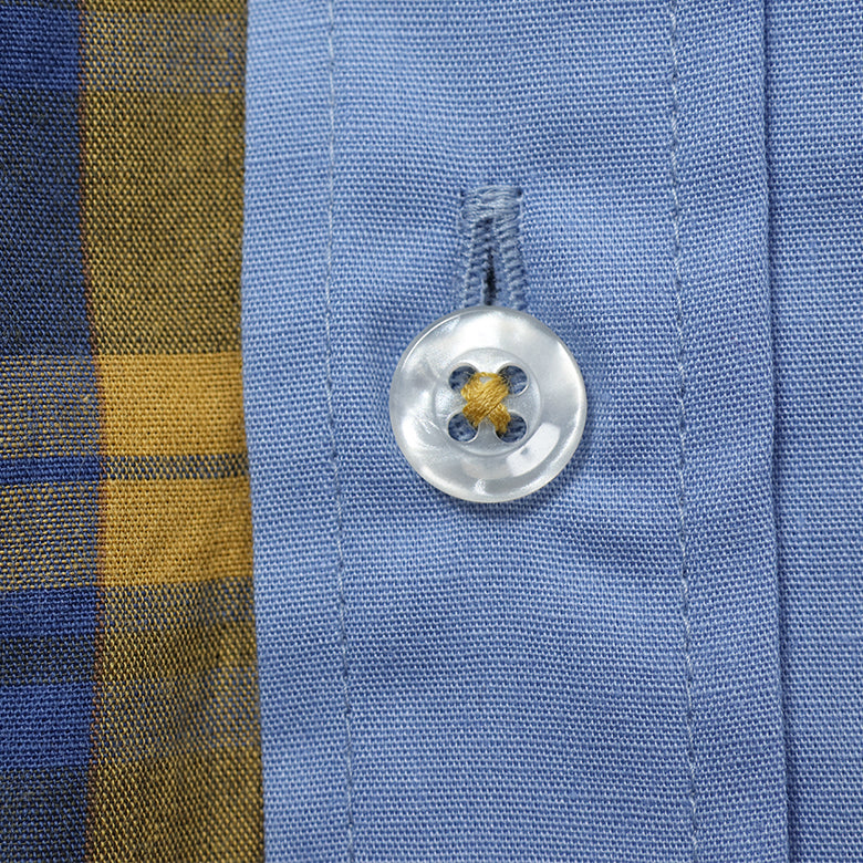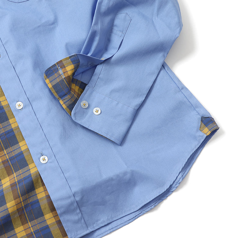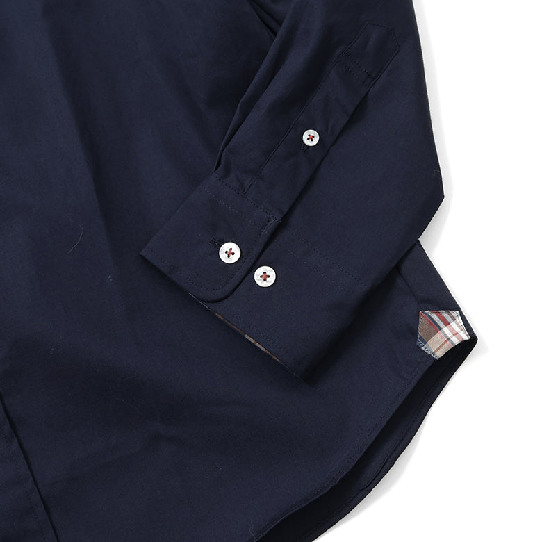 立ち襟仕様の本格的なつくりになっていますが、カジュアルな着こなしから、ドレスアップのコーディネートまで幅広くお使いいただける程よいバランスのシャツです。