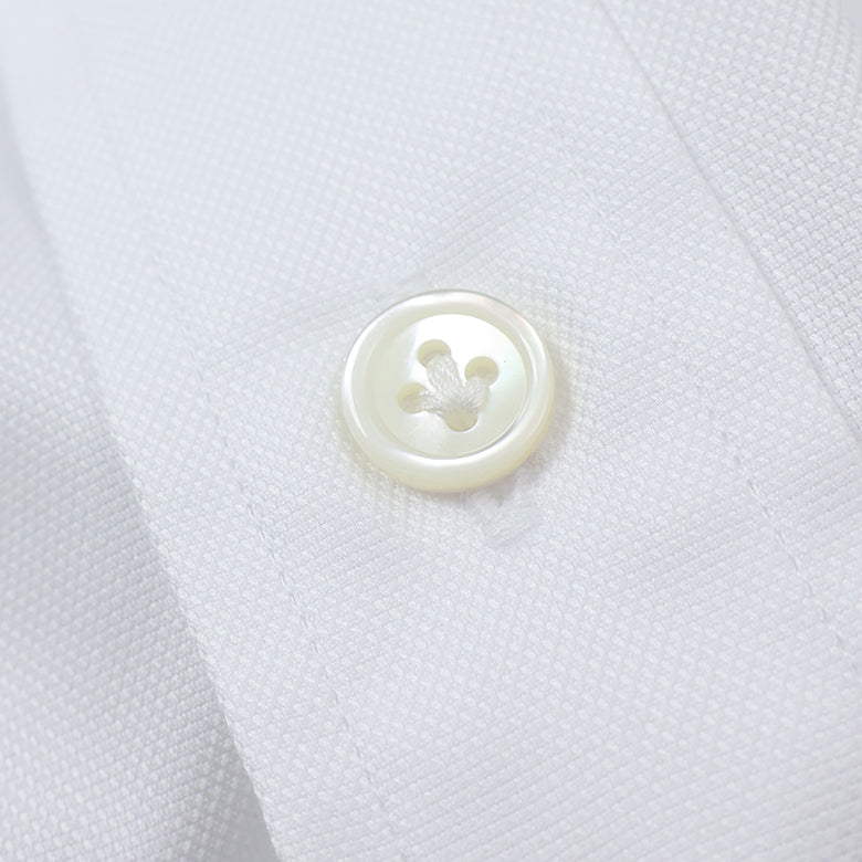 袖付け本縫い/脇本縫い/セットインスリーブ/袖口タック/フラシ芯地/運針24針/ポケットなし/高瀬貝ボタン鳥足付け