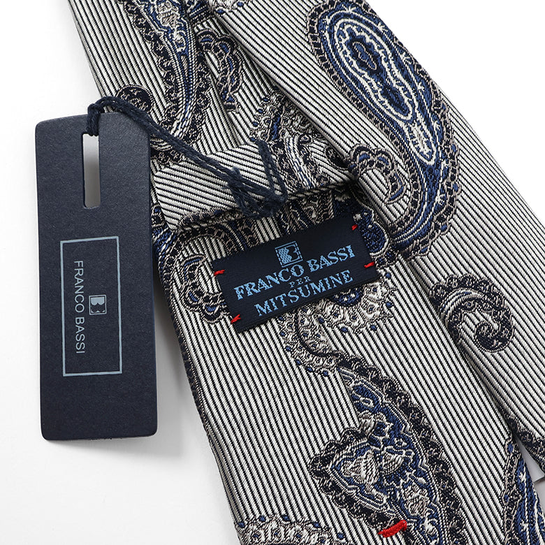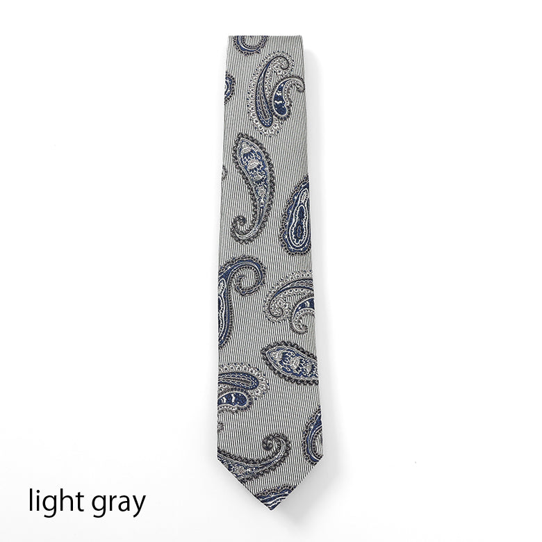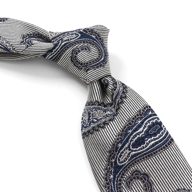 ライトグレーをベースに、ネイビーのペイズリーが映える上品な一本です。
